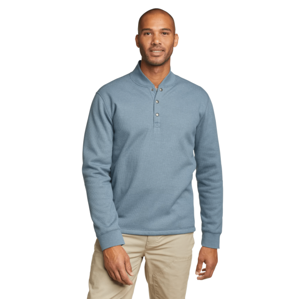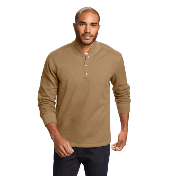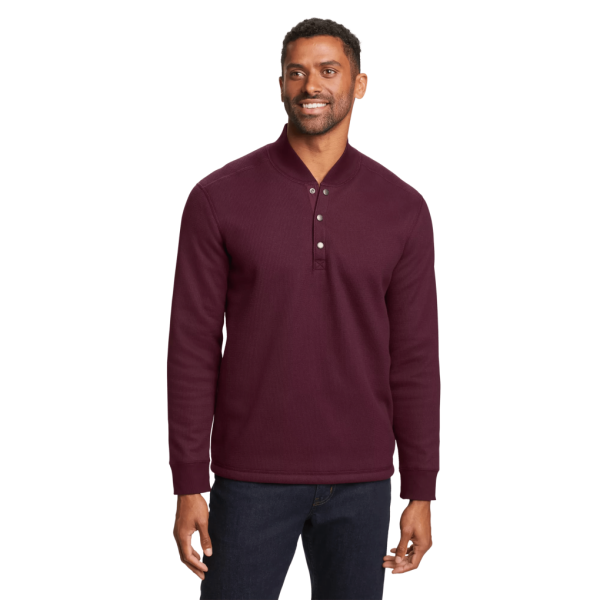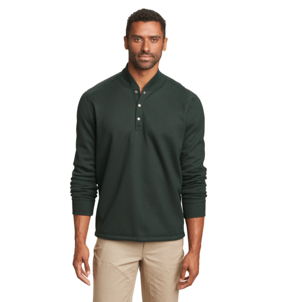 Robust, thermal-knit cotton/polyester is bonded to soft, faux-shearling fleece lining for substantial warmth without heavy bulk. The henley front placket makes it easy to layer under a waterproof shell or other jacket.