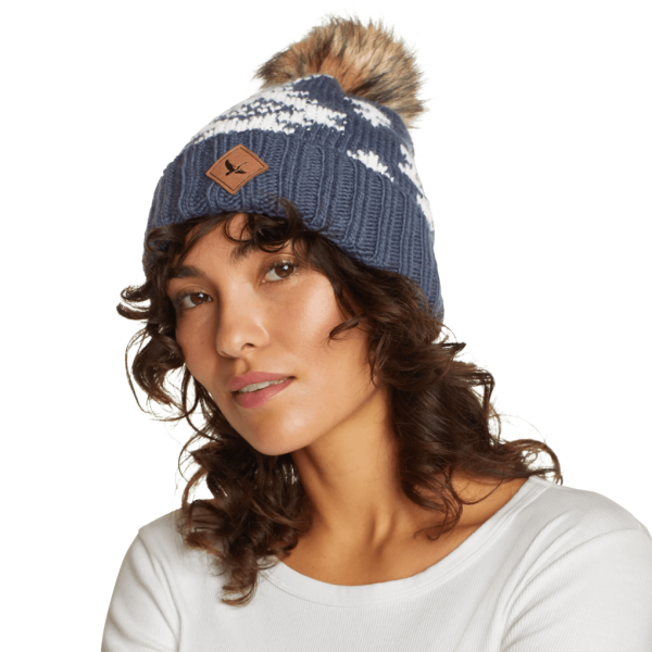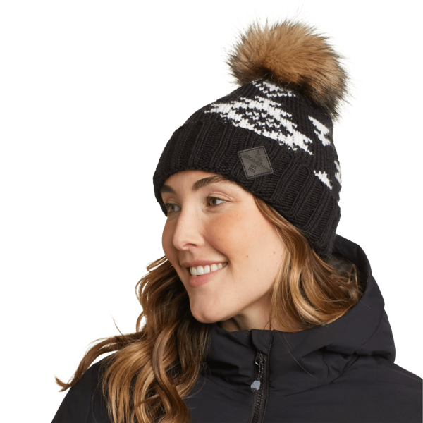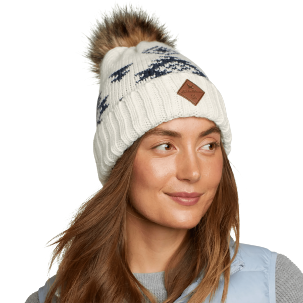 This beanie features soft, acrylic yarns, a faux fur pom, and an embossed leather patch on the 2.5″ cuff.